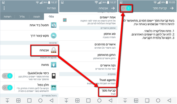 על מנת שתוכלו להשתמש באופציה הזו במהירות ברגע שתידרשו לכך, תצטרכו קודם כל להפעיל אותה בהגדרות המכשיר: בהגדרות המכשיר כנסו ל"אבטחה" וגללו למטה ל"קביעת מסך" לאחר מכן הסיטו את הבורר ימינה על מנת להפעיל את קביעת המסך. (ראו צילום מסך).