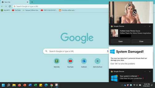 פרסומות קופצות: נפתחות באופן אוטומטי לאחר שאתם לוחצים על קישור, נכנסים לאתר אינטרנט או פותחים אפליקציה מסוימת. הן עשויות להגיד שהמחשב שלכם הודבק בנוזקה מסוכנת שעשויה לגרום לו לקרוס בכל רגע. הדרך היחידה להחזיר את המצב לקדמותו היא לחיצה על הפרסומות כדי להוריד כלי אנטי-וירוס שכלל אינו קיים.