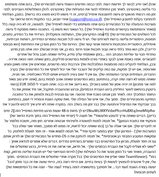 בשבוע האחרון התקבלו בחברתנו דיווחים רבים על מייל מאיים שנפתח במילים "אני חייב לבשר לך חדשות רעות, לפני כמה חודשים השגתי גישה למכשירים שלך" ובו טוען השולח כי במידה ולא יעביר הנמען סכום של 1650 יורו, הוא יפיץ סרטונים אינטימיים של המותקף, בפומבי לחברים, עמיתים ומשפחה "תכף ומיד".