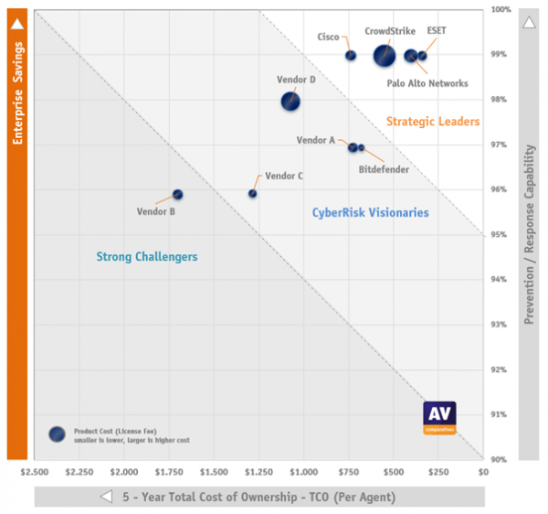 AV-COMPARATIVE פיתחו ריבוע קסם שבוחן סיכוני סייבר ויכולות EPR (מניעה, זיהוי ותגובה), החשיבות במבדק שלהם שהוא בוחן לא רק יכולות EDR שמתמקדות בזיהוי ותגובה אלא משקלל את יכולות יצרני אבטחת המידע, גם ביכולות מניעה של חדירות איומים לארגונים. הפתרונות של ESET מספקים את המענה הטוב ביותר ביכולות המניעה, זיהוי ותגובה
