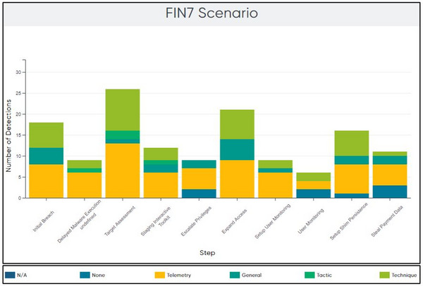 Figure 5 – Distribution of detection type by sub-step in the FIN7 scenario (Image source: MITRE Engenuity)
