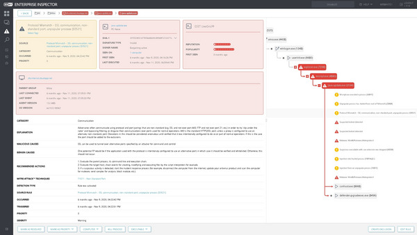 ESET Enterprise Inspector detected the creation of this SSL tunnel and collected additional contextual information useful for the SOC analyst, including details on the protocol mismatch and non-standard port usage, and the execution chain and process tree – highlighting further related events that were suspicious or clearly malicious.