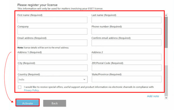 8. Type your name, phone number, email address and address in the required fields and select your country from the drop-down menu. Click Activate.