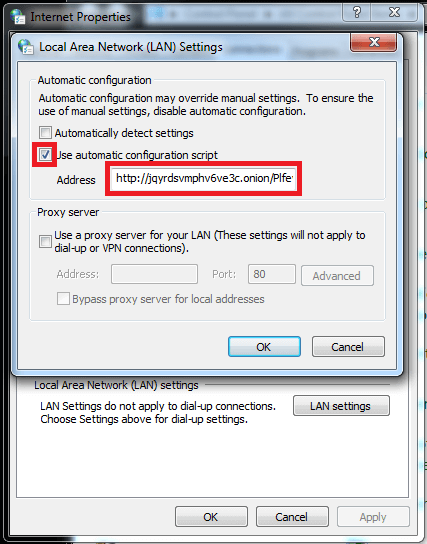 2. Presence of malicious Proxy Automatic Configuration script (PAC) pointing to a .onion domain