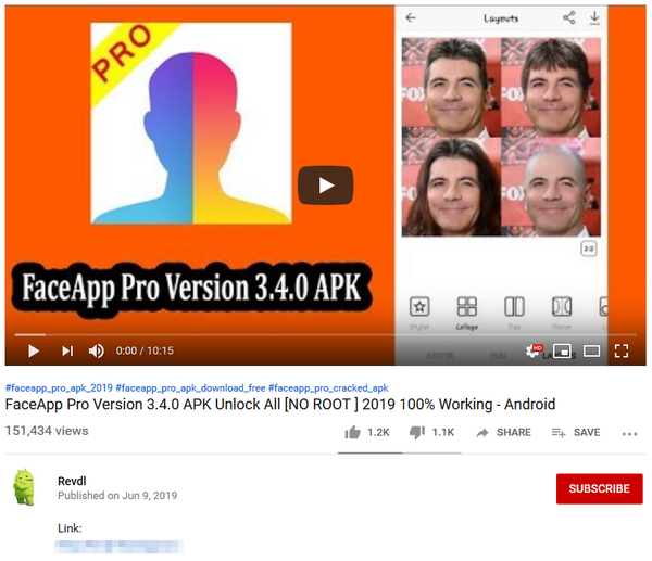 A YouTube video claiming to offer a link for downloading the installation package (APK) for a “FaceApp Pro” application for Android