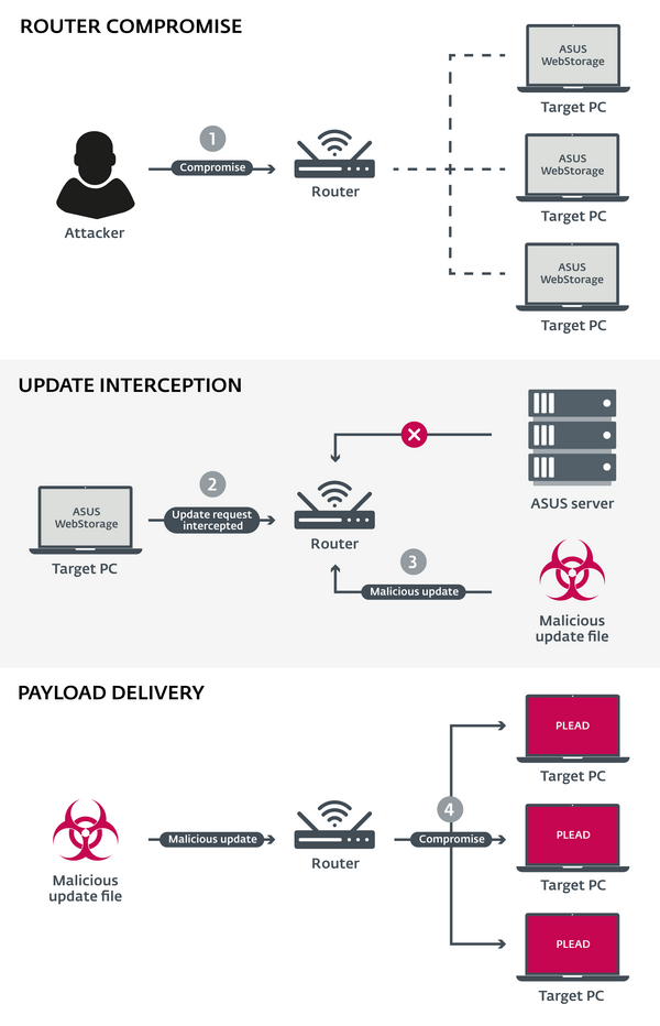 BRATISLAVA – ESET researchers have recently discovered that the attackers behind Plead malware have been distributing it using compromised routers and man-in-the-middle (MitM) attacks against the legitimate ASUS WebStorage software. The new activity was detected by ESET in the territory of Taiwan, where Plead malware is most actively deployed. It was previously reported that Plead malware is used by the BlackTech group in targeted attacks, primarily those focused on cyberespionage in Asia.