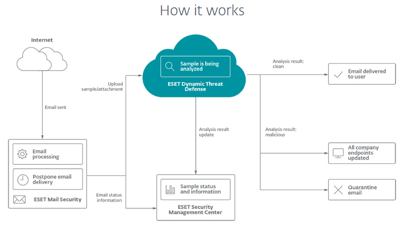 ESET Dynamic Threat Defense viene attivato per combattere questi scenari e le minacce che introducono nella rete. Le aziende più piccole possono utilizzare una tecnologia di sandboxing basata su cloud che utilizza più modelli di apprendimento automatico per rilevare nuovi tipi di minacce mai visti prima (chiamati 'zero day'). Un primo esempio possono essere gli attacchi alle email classificati come dannosi e quindi messi in quarantena, con il destinatario di posta elettronica e l'amministratore IT che ricevono informazioni sul rilevamento.