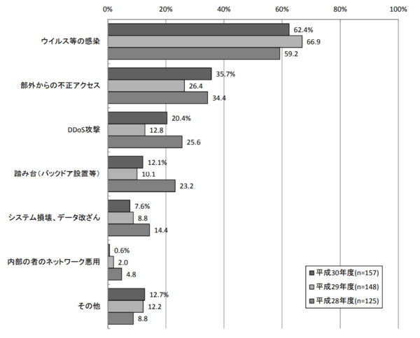 過去の統計を見ると、部外からの不正アクセスにより、マルウェアを仕込まれたケースが主体で、ターゲットはPCのようです。侵入経路は大きく分類するとインターネット接続、メール、USBメモリといった外部媒体です。