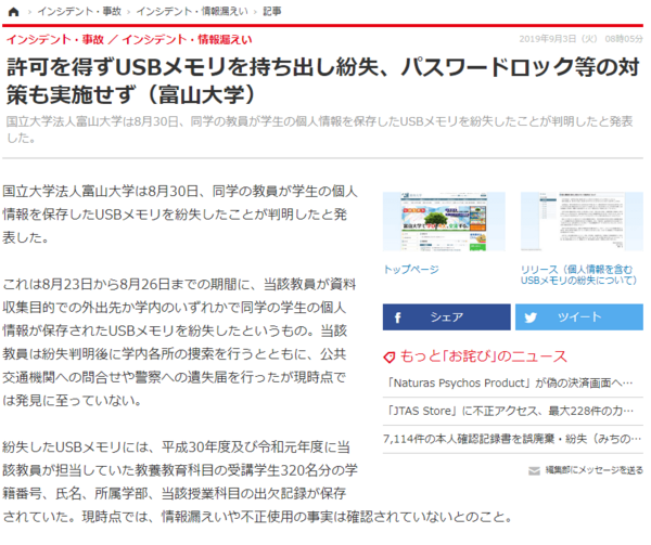 「許可を得ずUSBメモリを持ち出し紛失、パスワードロック等の対策を実施せず(富山大学)」