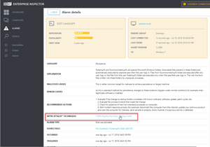 ALARMのDetails(詳細)を開けると、MITRE ATT&CK TECHNIQUESというインデックスがあり、そこで、今回のイベントで使用されたテクニックがMITREデータベースの索引ID(Tから始まる)と共に表示されています。そのリンクを辿れば、テクニックの詳細や付随する情報を確認できるというわけです。