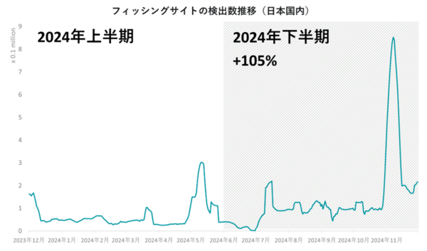 2024年下半期にはフィッシングサイトの検出が急増しました。日本国内における2024年下半期(2024年6月~11月)の検出数は2024年上半期(2023年12月~2024年5月)と比較して105%増加しています。