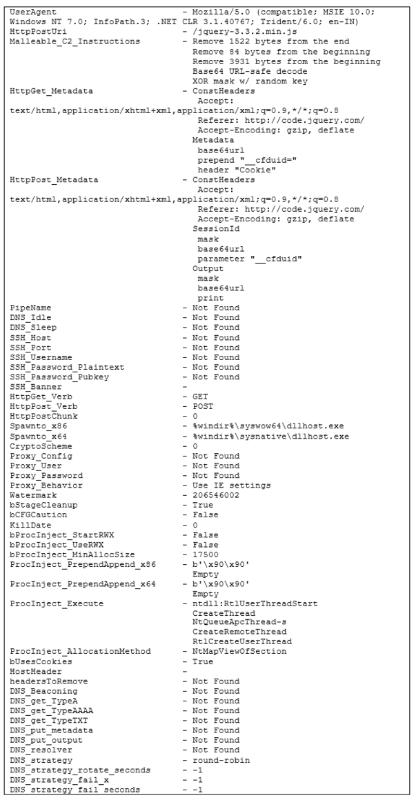 | ass | VMProtectでパッキングされたCobalt Strikeローダーをダウンロードして実行します。CobaltStrikeParserツールを使用して抽出したビーコンの設定は、Cobalt Strikeの構成 セクションのIoCに示しています。 |