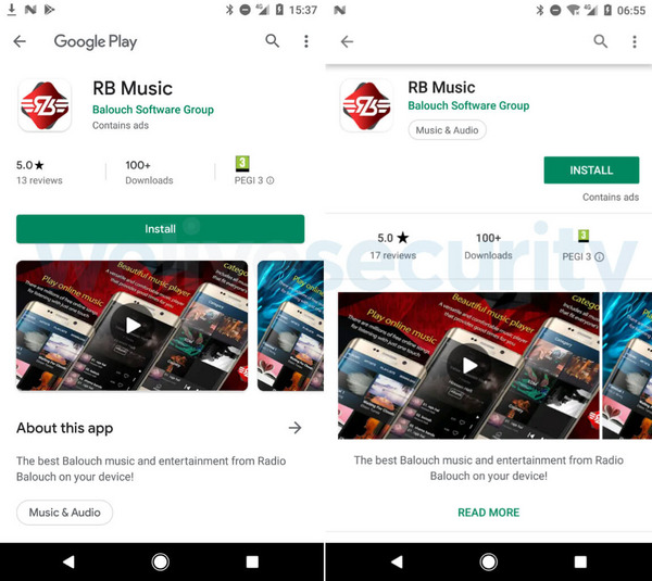 悪意のある Radio Balouchアプリは、Google Playに7月13日に再び掲載されました。この時もESETによって直ちに報告され、Googleによってすみやかに削除されています。