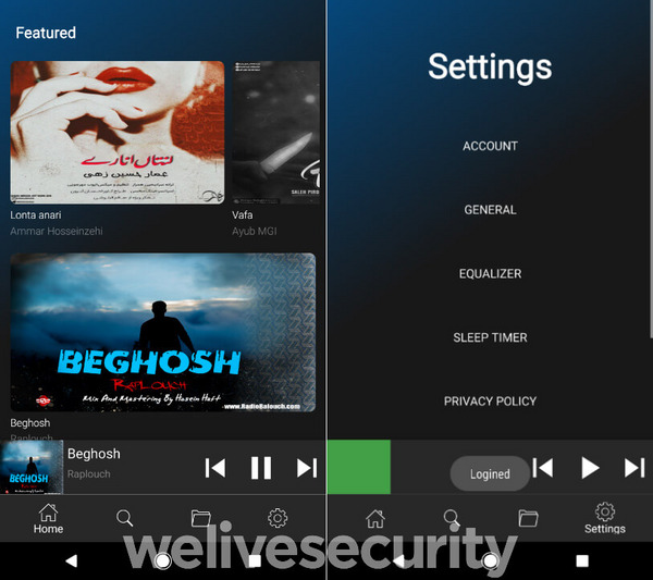 インストール完了後、インターネットラジオのコンポーネントはすべて問題なく動作し、バローチスターンの音楽をストリーミングで再生できます。しかし悪意のある機能が追加されており、連絡先やデバイスに保存されたファイルを盗み出しし、デバイスからSMSメッセージを送ります。