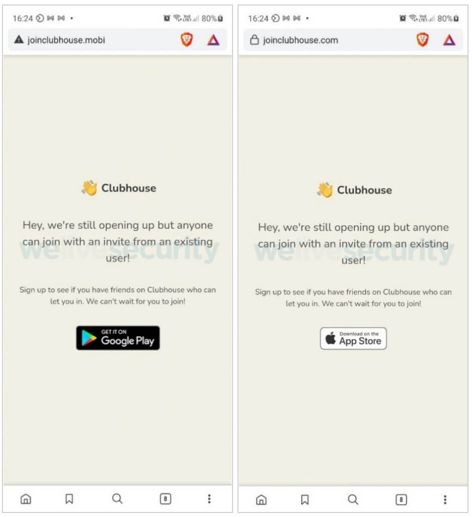 しかしボタンをクリックする前にいくつか不自然な兆候もあります。接続が安全でなかったり(HTTPSではなくHTTP)、正規のアプリのトップレベルドメイン(TLD)で使われている『.com』ではなく『.mobi』が使われています(図1参照)。そのほか最も明らかなのは、ClubhouseはAndroid版アプリをもう間もなくリリースする予定ですが、現時点ではiPhoneのみ利用可能です。