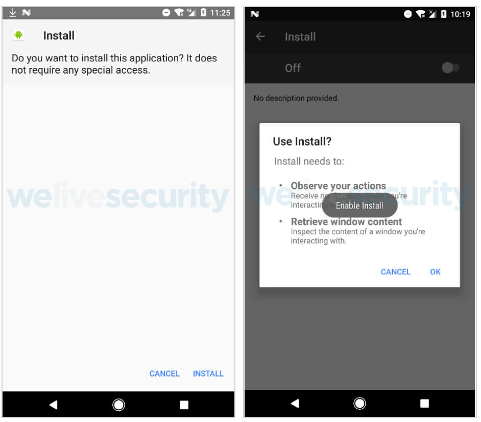 SMSを利用した二要素認証(2FA)はアカウントへの不審な侵入を防止しますが、今回の場合、マルウェアがテキストメッセージを傍受することができるため、必ずしもそうとは限りません。さらに、悪意のあるアプリは被害者にアクセシビリティサービスを有効にするように促し、実質的にサイバー犯罪者がデバイスを操作することを許可します。