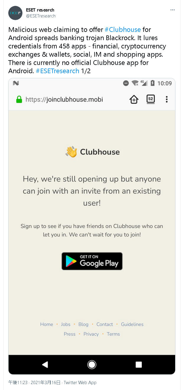 Android版の招待制音声SNSアプリ(実際にはまだ存在しない)に扮した悪意のあるパッケージが、正規のClubhouseのウェブサイトを模倣したウェブサイトから提供されています。ThreatFabricによって「BlackRock」と名付けられたトロイの木馬(ESETの検出名ではAndroid/TrojanDropper.Agent.HLR)は、少なくとも450以上のオンラインサービスで使用される被害者のログイン情報を取得する可能性があります。