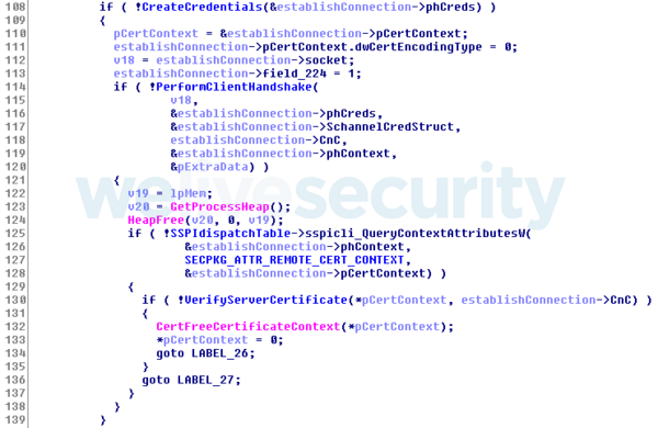 Schannelを介したこのマルウェアのTLSの実装は、Coast Research & Developmentのこのサンプルに似ています。このサンプルには、認証情報の作成、クライアントハンドシェイクの実行、サーバー証明書の検証が含まれます。