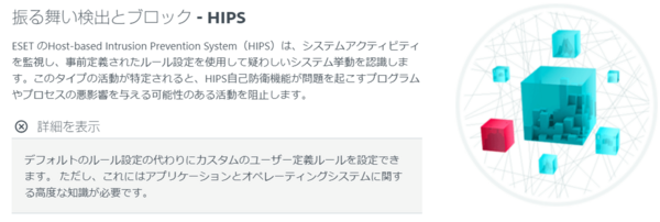 HIPSは、多くのESET製品に組み込まれている挙動ベースの検出フレームワークであり、詳細な検査な実行したりブロックしたりする必要がある疑わしい挙動について、下位レベルのAPI呼び出しを監視する高度な機能を提供します。