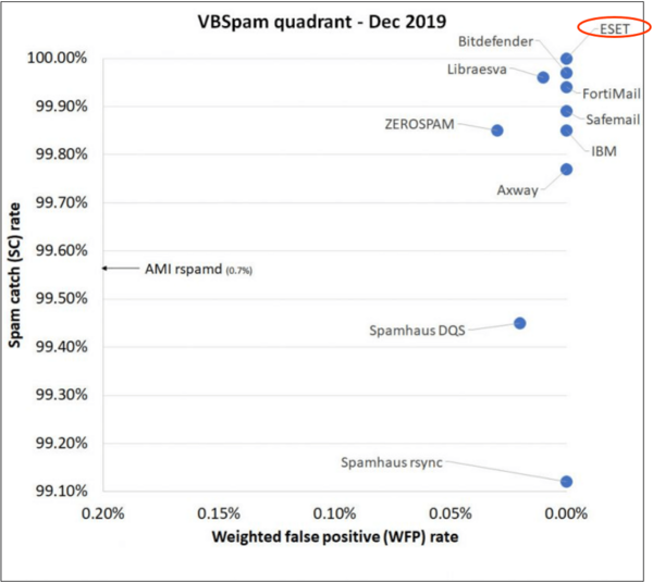 ESET Mail Security for Microsoft Exchange Serverを利用されているビジネスユーザーにとって幸いなことに、VBSpamテストでは、スパム、フィッシング、マルウェアの検出率は競合他社の中でESETが最も高く、誤検知率も最も低いことが示されています。