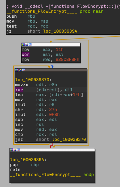 CloudMensisは、その作成者がFlowEncryptと呼んでいる独自の暗号化関数を実装しています。図8は、分解された関数を示しています。1バイトをシードとして受け取り、直近で生成されたバイトに対して一連の演算を実行して残りの鍵を生成します。入力はこのキーストリームを使用してXORされます。最終的に現在のバイトの値は、その前の値の1つと同じになるため、キーストリームはループします。つまり、この暗号化は一見複雑なように見えますが、単に静的な鍵を使用したXORです(ループ処理を開始する前、キーストリームの最初の数バイトは除きます)。