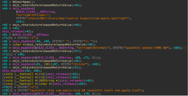 次に、launchctl setenvを使用してHOME環境変数を~/Library/Application Support/com.apple.spotlightに設定し、TCCデーモンが正規のデータベースではなく、攻撃者が準備したデータベースをロードするように設定します。図10は、NSTaskを使用してこの処理を実行する方法を示しています。