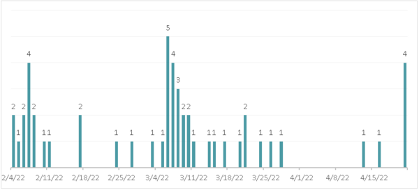 このチャートは、最初の侵害が2月4日であり、2022年3月上旬に侵害が急増していることを示しています。侵害の最後のピークは、CloudMensisがVirusTotalにアップロードされ、CloudMensisを実行したサンドボックスによって引き起こされた可能性があります。