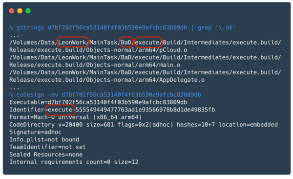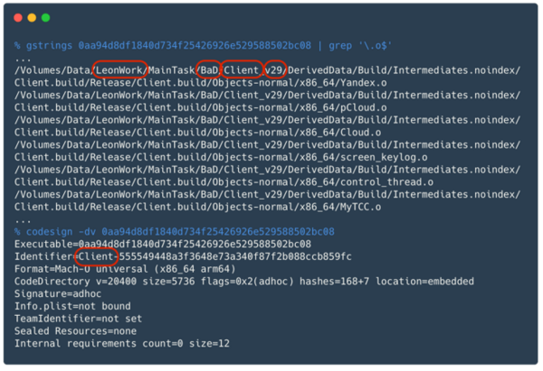 両方のコンポーネントに残されている攻撃の痕跡(アーティファクト)から、このマルウェアの作成者はこれらのコンポーネントをexecuteとClientと呼んでおり、前者はダウンローダー、後者はスパイエージェントであることがわかりました。これらの名前は、オブジェクトの絶対パスと専用の署名の両方で見つけることができます。