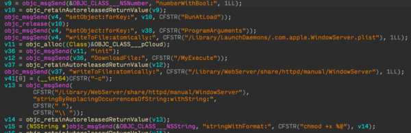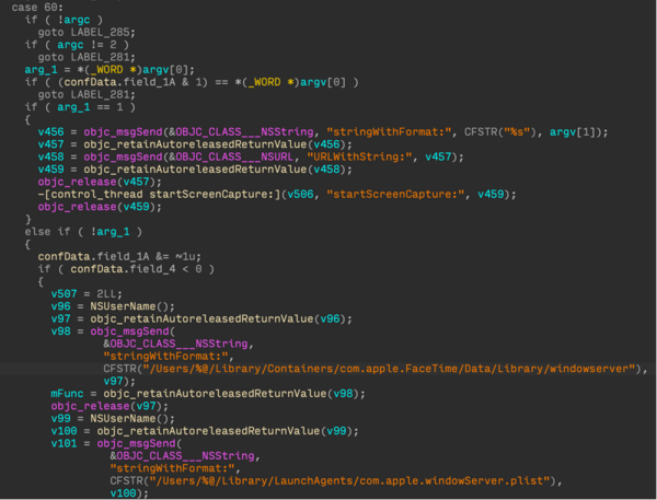 図12は、さらに複雑な例を示しています。ID 60のコマンドは、画面キャプチャを開始するために使用されます。第1引数が「1」の場合、第2引数はstartScreenCaptureによってダウンロード、保存、実行されるファイルへのURLになります。この外部にある実行ファイルは、FaceTimeのサンドボックスコンテナのLibraryフォルダにwindowserverとして保存されます。第1引数が「0」の場合、以前にドロップされている既存のファイルを起動します。この画面キャプチャエージェントの検体は見つかっていません。