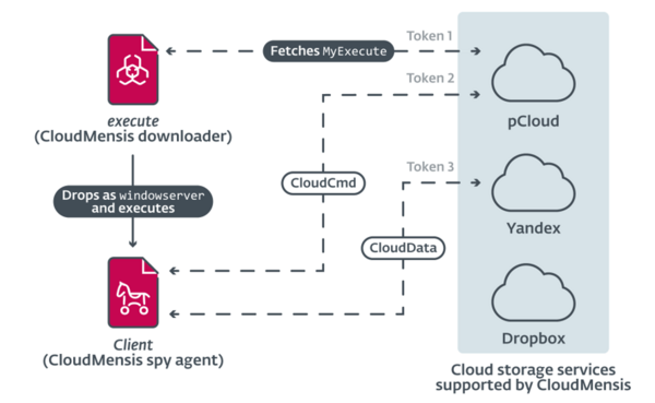 CloudMensisは、オペレータからコマンドを受信しファイルを外部に流出させる両方の目的でクラウドストレージを使用しています。pCloud、Yandex Disk、Dropboxの3つのストレージプロバイダが使用されています。解析した検体の構成には、pCloudとYandex Diskの認証トークンが含まれていました。