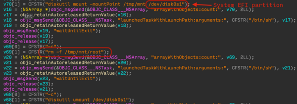 第1段階のコンポーネントには、removeRegistrationというメソッドが含まれています。このメソッドは、Safariのサンドボックスを回避するエクスプロイトが成功した後に、クリーンアップする目的で存在していると考えられます。EFIシステムパーティションからrootというファイルを削除し(図5)、XPCメッセージをspeechsynthesisdに送信し(図6)、Safariキャッシュディレクトリからファイルを削除しています。これらの一見無関係に見える操作を実行していたことから、このメソッドの目的を最初は特定できませんでした。ESETは当初、removeRegistrationの目的はCloudMensisの旧バージョンをアンインストールすることだと考えていましたが、詳細な調査の結果、これらのファイルは4つの脆弱性を悪用してSafariからサンドボックス回避や権限昇格のエクスプロイトを起動するために使用されていたことがわかりました。これらの脆弱性は、2017年にNiklas Baumstark氏とSamuel Groß氏によって発見されており、詳細に分析されて文書化されています。Appleは、これらの4つの脆弱性のパッチを同じ年に公開しているため、CloudMensisをインストールするためにこの配信方法は使われていないと考えられます。このコードが実行されなくなったのは、パッチが公開されたことが理由でしょう。また、これはCloudMensisが以前から存在していた可能性を示唆しています。