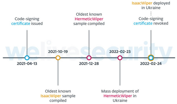 2022年2月24日、ESETはウクライナ政府のネットワークで別の新たなワイパーを検出しました。ESETはこのワイパーをIsaacWiperと命名し、HermeticWiperとの関連について現在分析しています。特筆すべき点は、IsaacWiperは、HermeticWiperの影響を受けていない組織で検出されています。