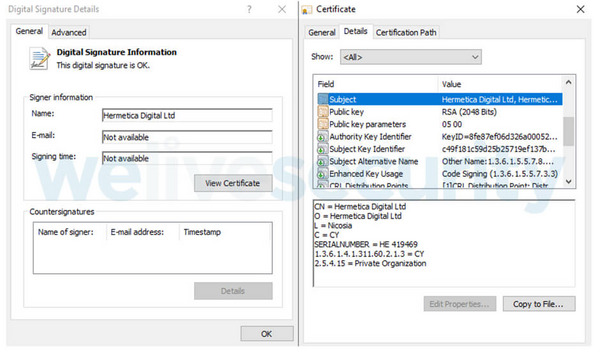 HermeticWiperおよびHermeticWizardは、2021年4月13日に発行されHermetica Digital Ltdに割り当てられたコード署名証明書(図1)によって署名されています。ESETは、発行元のCA(DigiCert)に証明書を無効にするように要求し、2月24日にこの証明書は失効しました。