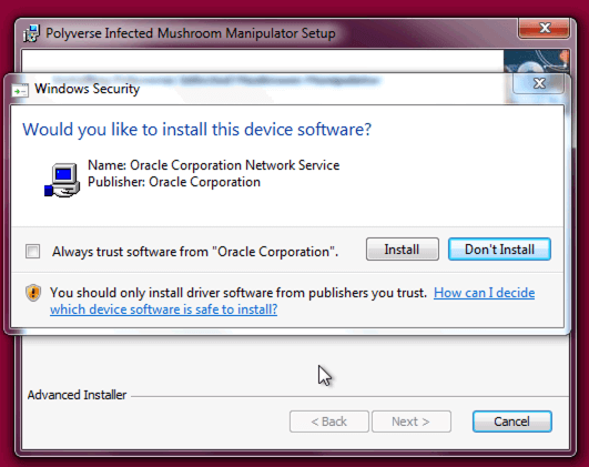 - 予期していなかった「追加の」インストーラ(この場合はOracleネットワークアダプタ)からの信頼ポップアップ。