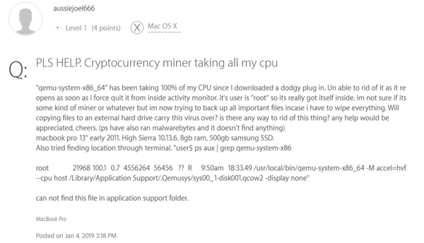 Activity Monitorプロセスが実行中の場合、qemuserviceはイメージを起動しません。実行中の場合には、起動元のplistをアンロードします。tools-service.daemonは、qemu-system-x86_64プロセスが実行されておらず、45分間スリープした後に限り、イメージを起動します。System-monitor.daemonは、Intel i5、i7、またはi9のCPUが検出された場合に限り、イメージを起動します。これらのスクリプトは、名前とイメージパスが異なるだけで、同じコマンドを使用してQEMUイメージを起動します。 ESETでは、マイナーのバージョン1に関連する次のスクリーンショットを発見しました。