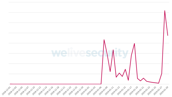 ESETのテレメトリデータによると、最新の「ラブ・ユー」攻撃は2019年の1月28日に開始しており、図 1 で見られるように、今や初めの頃のほぼ倍に増加しています。
