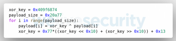 暗号化されたペイロードは、hpqhvsei.dllの.rdataセクションにあり、復号化アルゴリズムは図3に示すように、XORキーが各反復で更新されるXORループです。