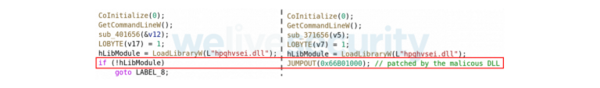 パッチが適用されるコード部分は、hpqhvind.exeの主要な関数の最初にあります。図2に示すように、パッチが適用されるコードは、hpqhvsei.dllをロードするコードの直後にあります。これは、ペイロードの復号化と実行を行う関数が、悪意のあるDLLをロードした直後に実行されることを意味します。