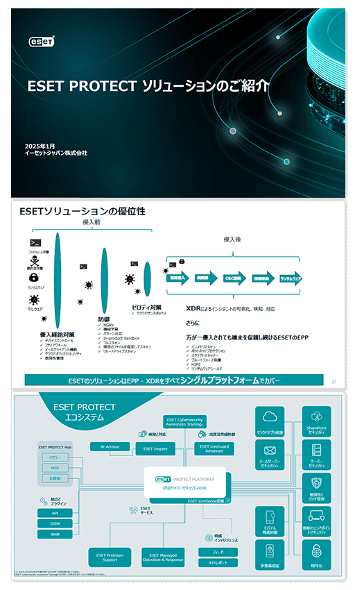 多様化するサイバー攻撃に必要な対策を実現する「ESET PROTECTソリューション」ご紹介資料を提供しています。