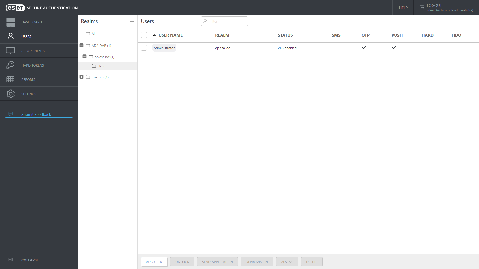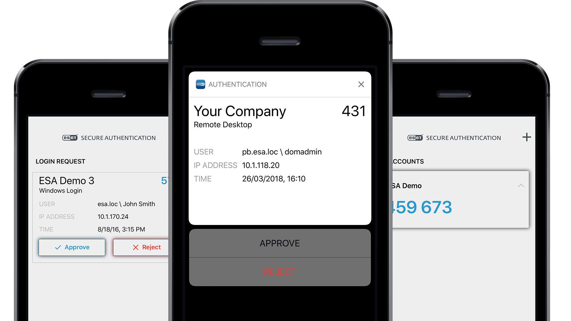 ESET Secure Authentication은 모바일 앱, 푸시 알림, 하드 토큰 및 OTP (one-time password) 전달을 위한 SMS 및 사용자 정의 방법을 지원합니다.