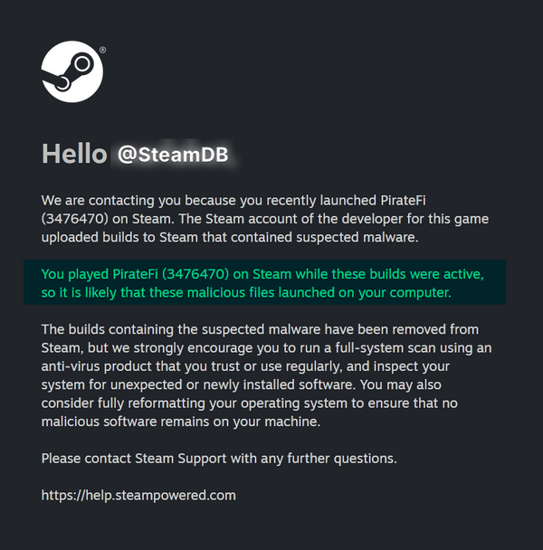 A su vez, Valve (la compañía detrás de Steam), envió un mensaje a las personas que descargaron el juego, en donde informaba: “La cuenta del desarrollador de este juego cargó compilaciones que contenían malware. Jugaste PirateFi en Steam mientras estas compilaciones estaban activas, por lo que es probable que estos archivos maliciosos se hayan lanzado en tu PC”. Y recomendaban “encarecidamente” ejecutar un análisis completo del sistema utilizando una solución antivirus.