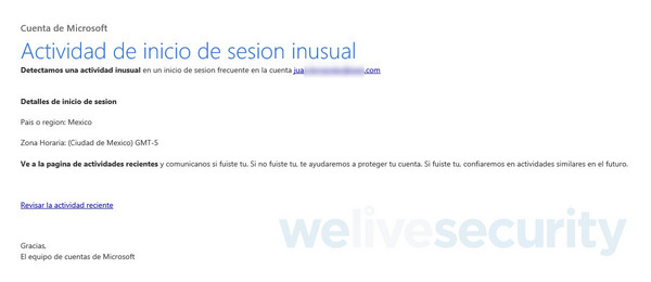 En este ejemplo, el correo que suplanta la identidad de Microsoft Outlook, alude a una supuesta actividad inusual en el inicio de sesión. Al ser una modalidad que suele utilizar este tipo de servicios para notificar a los usuarios sobre un posible acceso indebido a sus cuentas, es probable que despierte el interés de los usuarios y muchos decidan acceder a los enlaces incluidos en el mensaje.