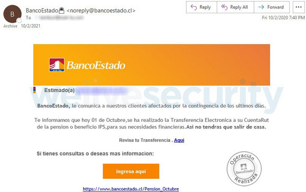 Las entidades bancarias también son utilizadas frecuentemente para los ataques de phishing. En este caso real, los cibercriminales se hicieron pasar por el Banco Estado de Chile para hacer creer a los clientes que la entidad realizó la transferencia de la pensión o beneficio, con el único objetivo de robar las credenciales de acceso a la banca en línea y los datos de la tarjeta de débito.