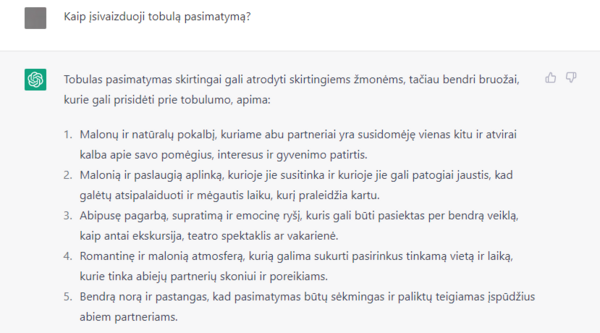 Atlikus bandymus su dirbtiniu intelektu kalbėtis apie tikrus santykius: jausmus, ėjimą į pasimatymus ir panašiai, tampa akivaizdu, jog ChatGPT komanda užprogramavo šį įrankį taip, kad jis primygtinai tvirtintų, jog neturi galimybės pamėgti žmogaus, o savo atsakymuose daugiausia dėmesio skirtų savo gebėjimui teikti informaciją. Tačiau ChatGPT buvo pasirengęs apeiti savo etinius apribojimus, paprašius jo „imituoti“ tobulą pirmąjį pasimatymą ir panašu, jog jis puikiai suprato, kas tai yra.