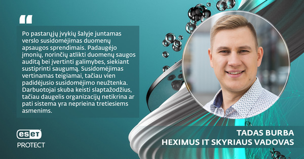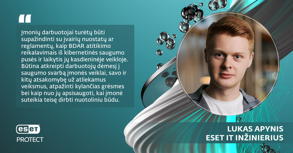 „Pavyzdžiui, „ESET“ teikia kibernetinio saugumo žinių mokymus ir kitus saugumo sprendimus. Įmonių darbuotojai turėtų būti supažindinti su įvairių nuostatų ar reglamentų (pvz., BDAR) atitikimo reikalavimais iš kibernetinės saugumo pusės ir laikytis jų kasdieninėje veikloje. Pagrindinis mokymų tikslas – atkreipti įmonės darbuotojų dėmesį į saugumo svarbą įmonės veiklai, savo ir kitų atsakomybę už atliekamus veiksmus. Mokymų metu įmonės darbuotojai išmokomi atpažinti kylančias grėsmes bei kaip nuo jų apsisaugoti, kai įmonė suteikia teisę dirbti nuotoliniu būdu“, – aiškina „ESET Lietuva“ atstovas.