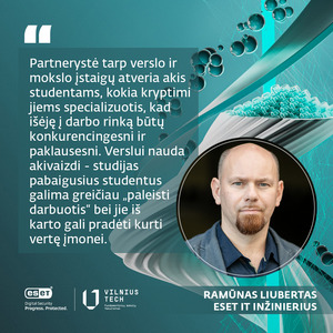 Besimokydami studentai įgyja daug teorinių žinių ir, žinoma, praktinių žinių - būtent čia atsiranda erdvė bendradarbiavimui su verslais. Tai ne tik paįvairina kasdienę mokymosi rutiną, daro studijų programą įdomesnę ir patrauklesnę, bet ir leidžia studentams susipažinti su naujausiomis Lietuvos IT įmonių technologijomis bei suprasti, kokį karjeros kelią gali pasirinkti, ar tokiu būdu netgi susirasti darbą. Pasirašę partnerystės sutartis VILNIUS TECH bei ESET Lietuva įgyvendino ne vieną bendrą projektą: per pusmetį įmonės specialistai-lektoriai skaitė paskaitas Informacijos ir IT saugos magistrantūros studentams, su pranešimu apie ransomware tipo virusą dalyvavo „Jaunųjų mokslininkų konferencijoje“, vedė kibernetinio saugumo mokymus VILNIUS TECH bendruomenei, organizavo praktines užduotis bei studentus nemokamai kvietė dalyvauti kibernetinio saugumo simuliacijoje - IT specialistų mokymuose ESET ON: Capture the flag.