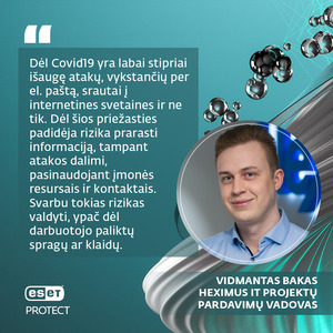 V. Bakas pastebi, kad paprastam darbuotojui yra ganėtinai sudėtinga identifikuoti kibernetinius nusikaltėlius, kai šie beldžiasi į darbuotojų kompiuterius. „Dėl Covid19 yra labai stipriai išaugę atakų, vykstančių per el. paštą, srautai į internetines svetaines ir ne tik. Dėl šios priežasties padidėja rizika prarasti informaciją, tampant atakos dalimi, pasinaudojant įmonės resursais ir kontaktais. Svarbu tokias rizikas valdyti, ypač dėl darbuotojo paliktų spragų ar klaidų.“ - dėmesį atkreipia V. Bakas.