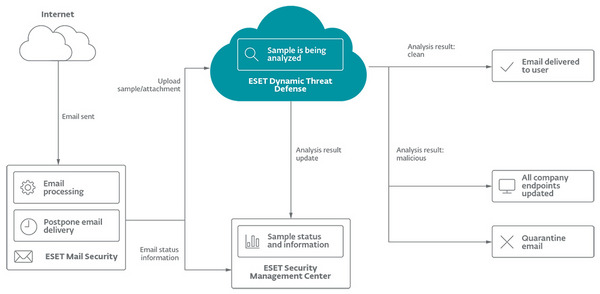 - ESET Dynamic Threat Defense atlieka įtartinų failų nuskaitymą ir sugrąžina saugius failus atgal į Mail Security. Tai trunka vos 5 minutes.