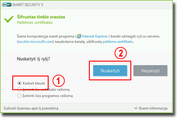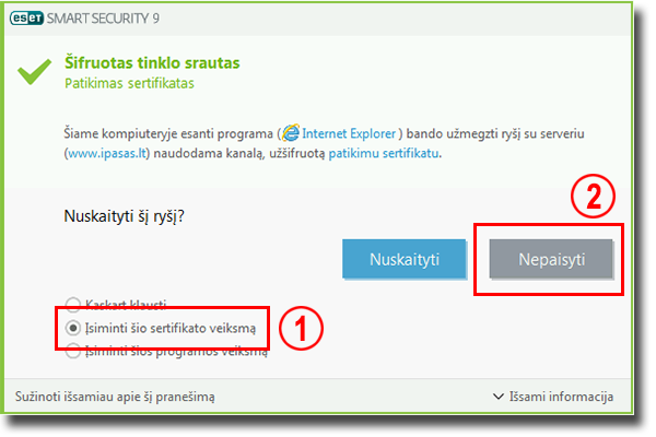 Pasiekus reikiamą puslapį, pavyzdžiui, www.ipasas.lt. Įsiminkite šio sertifikato veiksmą ir pasirinkite „Nepaisyti“.